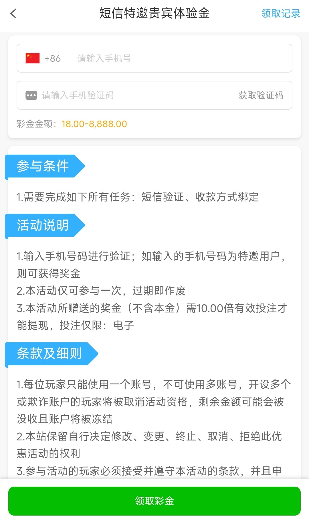 在优惠里申请彩金,10倍流水,仅限娱乐电子,要是之前领过了可以联系客服解绑手机号重新注册,但需要提供个人信息以及照片