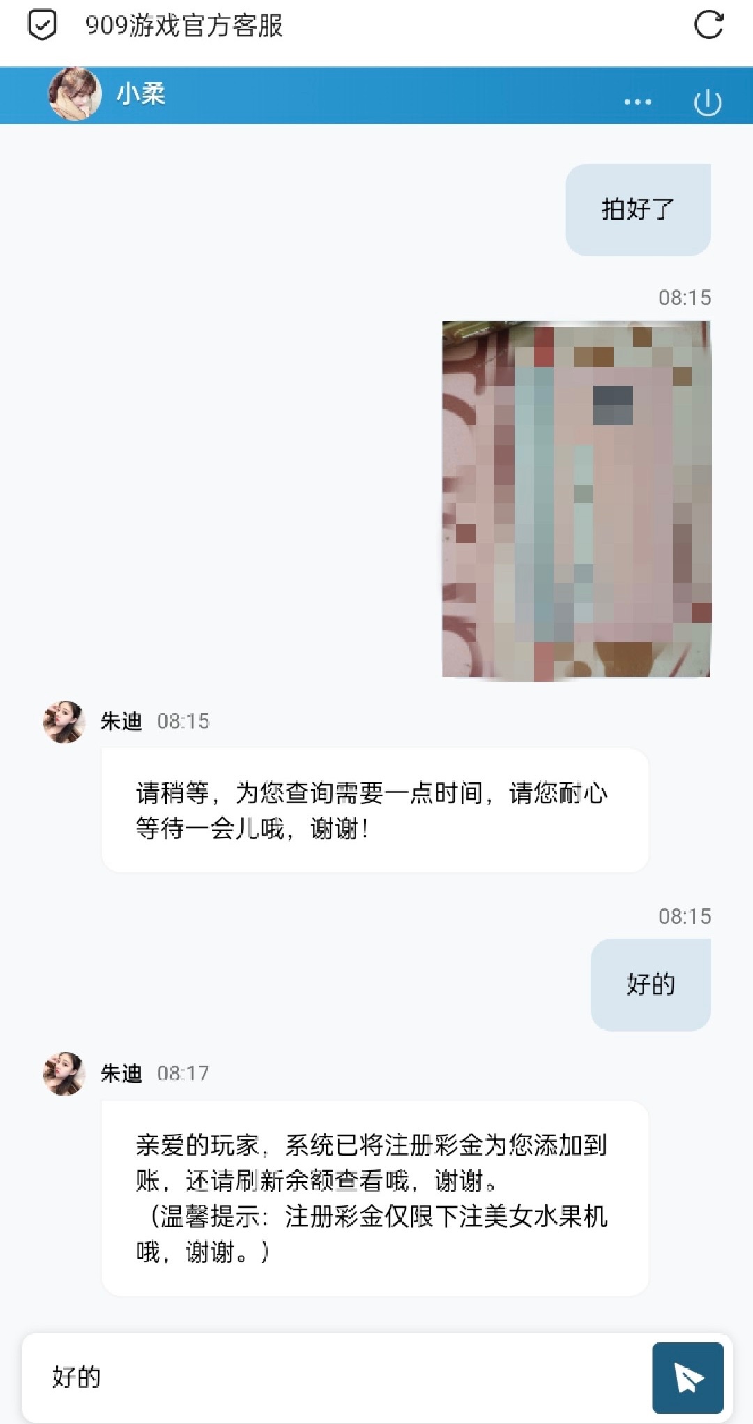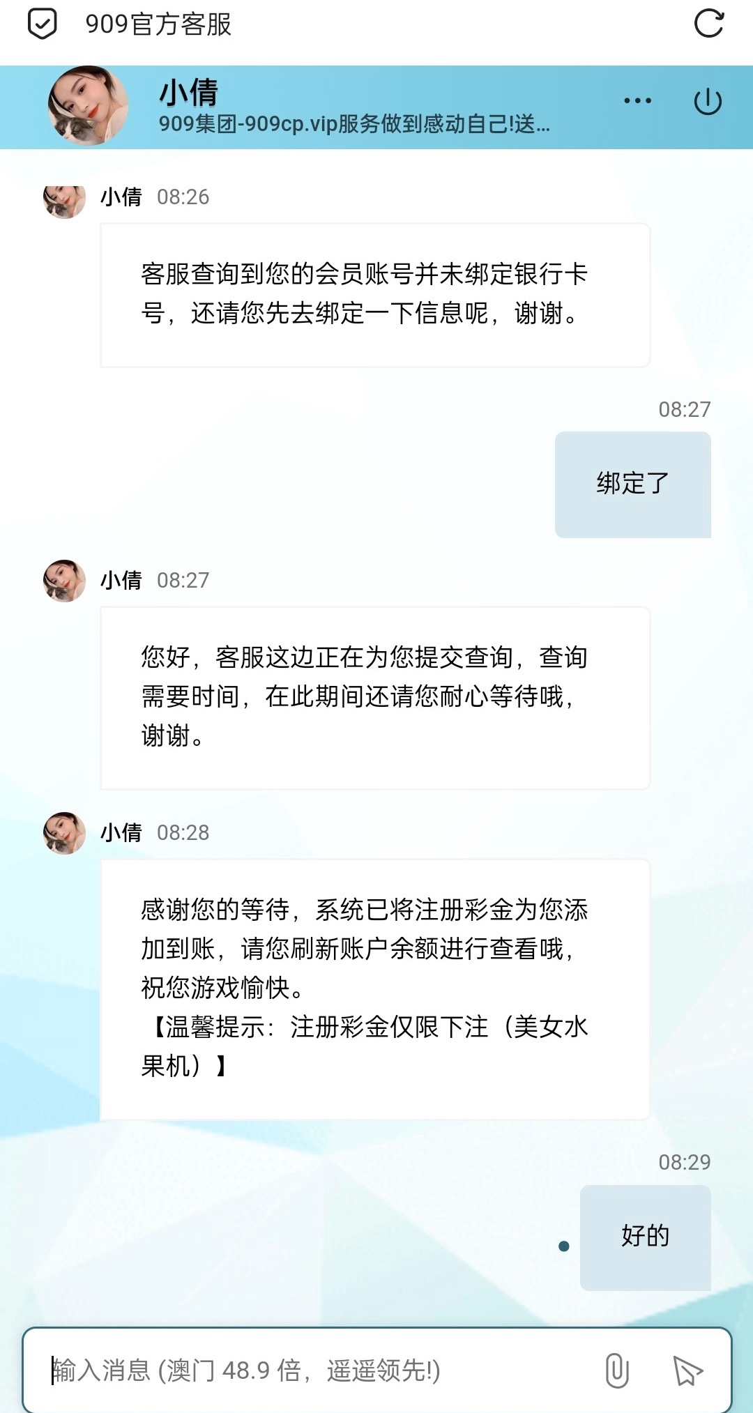 先打开六合宝典然后进入页面 有两个909一个是909彩票一个 往下滑还有一个909游戏  两个都可以申请 先截图进入链接注册后联系客服  领取18注册彩金 需要提供银行卡照片 介意的可以不要去了 限制玩美女水果机  10倍水