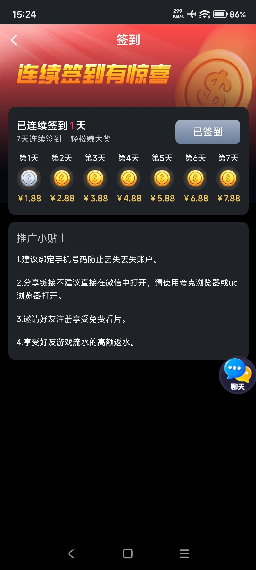 下载APP登入上在每日任务里面签到,1.88-7.88每周重置一次,首次提款可能要提银行卡
